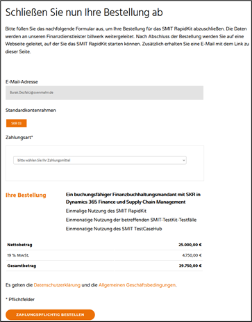 Ähnlich wie beim Onlineshopping musste ich das SMIT RapidKit zunächst kaufen. Dafür habe ich die Rechnungsdaten hinterlegt und den gewünschten Standardkontenrahmen ausgewählt.